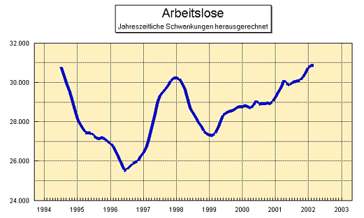 Im Januar schlägt zu Buche, daß es dem Baugewerbe aufgrund der Witterung sehr schlecht geht, deshalb saisonbedingte Kündigungen nicht ausbleiben. Dies betrifft fast alle Unternehmen. 2.400 Zugänge kommen allein aus diesem Bereich, wobei die meisten eine Wiedereinstellungsgarantie haben. Der WIG-Konkurs oder das ausgelaufene 249h-Projekt im MZ-Altstandort taten ihr übriges. Im Februar steigen die Zahlen noch, das wissen wir schon wegen neuer Kündigungen.