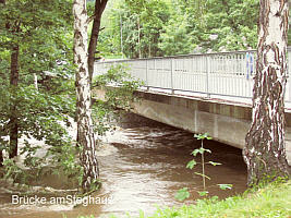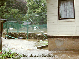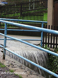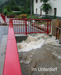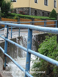 Am Mittag war klar, dass da nicht nur ein kleines Hochwasser zusammenlief. Am Abend war bereits im ganzen Erzgebirge Katastrophe ausgerufen. Am Dienstag (13.08.) war die Stegbrücke über die Zschopau gesperrt, denn der Fluss tobte bis fast an die Unterkante der Brücke. - Selbst der Krumhermersdorfer Dorfbach war zum reißenden Gewässer geworden (Bild vom Unterdorf), da überall heftig Wasser zulief.