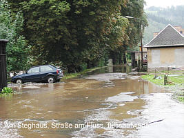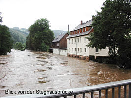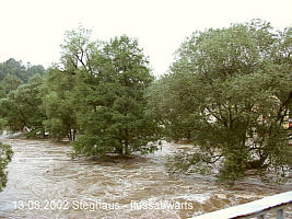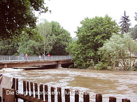 | Nachdem es den ganzen Sonntag (11.08.) wie aus Eimern gegossen hatte, fühlten wir uns schon etwas an die Flut in Marienberg 1999 erinnert. »Im Unterdorf und an der Zschopau wird man wohl mächtig unruhig werden!« - Es regnete (nein, schüttete) den ganzen Montag weiter. Früh war die Zschopau schon merklich gestiegen und schmutzig - schade um das schöne Bergwerk!
