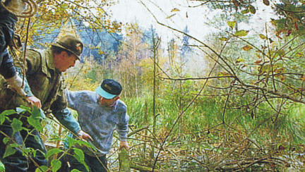 | Ohne Gummistiefel geht gar nichts, auch ohne gemeinsame Anstrengung nicht: Gottfried Meyer, Steffen Neubauer und Hans-Jörg Bruder (v. l.) von der Gruppe Umwelt und Naturschutz. |