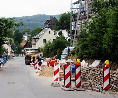 Eine an sich schon enge Stelle der Dorfstraße im Ort verlangt den LKW- und Busfahrern zur Zeit Meisterstücke im Rangieren ab: Im Mitteldorf zwischen Parkettservice Arnold und der Alten Post wird die Stützmauer für den steilen Hang erneuert. Die enge Stelle wird noch enger, und leider liegt diese enge Stelle in einer sanften Kurve.