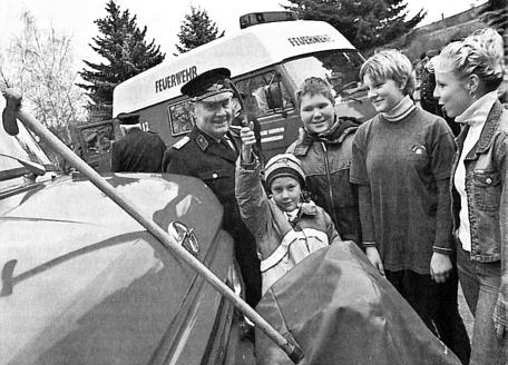 Werner Gläser, ältester Feuerwehrmann der Gemeinde, kann Enkel Benjamin, Felix Schneider, Juliane Relchel und Claudia Henkel Cv. 1) von der Jugend- feuerwehr viele Geschichten über den Oldtimer erzählen. |