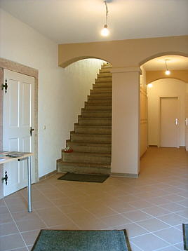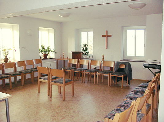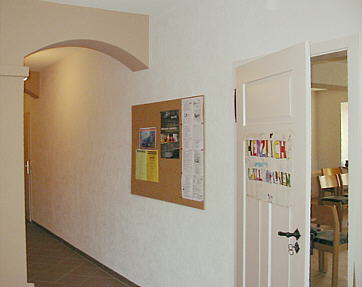 | Fast 50 Jahre lang war das Erdgeschoss des Pfarrhauses zur Hälfte Wohnung. Eine Lösung, die aus der Wohnungsnot nach dem Krieg entstand, als zahllose ausgebombte Städter und aus Polen und Tschechei Vertriebene dringend ein Dach über den Kopf brauchten. Über 3.000 Einwohner hatte Krumhermersdorf damals zeitweilig! Schon 1945 wurden im Pfarrhaus Flüchtlinge aufgenommen, und 1958 wurde eine richtige Kleinwohnung eingerichtet. Inzwischen ist diese Zahl auf 1.675 geschrumpft, und Wohnraum ist im Überfluss vorhanden. Darum wurde diese Wohnung der inzwischen verstorbenen Frau Nestler zum schönen und wesentlich größeren Gemeindesaal umgebaut. Über eine herausnehmbare Trennwand kam sogar noch die bisherige Kanzlei mit hinzu. Hier nun ein Blick auf neu vorgerichteten Flur, Gemeindesaal (rechts) und Kanzlei (links) |