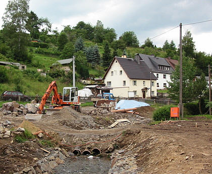 werden zur Zeit im Unterdorf beseitigt: Hier der Ausbau des Bachbettes am unteren Ende der Talstraße. Wenn man freilich bedenkt, welch große Steine das Hochwasser 2002 in manchen Tälern fortspülte, dann kann man dieses Bachbett sicher nicht als "hochwasser-sicher" bezeichnen. Kann man überhaupt hochwasser-sicher bauen? Vielleicht schon. Aber wer wird das bezahlen?
