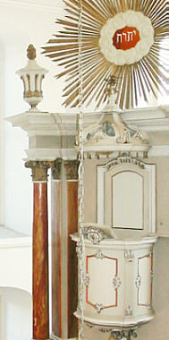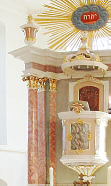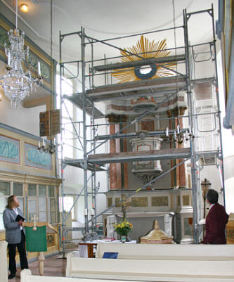 Der Krumhermersdorfer Pfarrer Johannes Roscher (r.) im Gespräch mit Kantor Andreas Martin vor dem Altar in der evangelisch-lutherischen Kirche. Der Altar wurde vier Wochen lang einer VerjLingungskur unterzogen und sieht nach der Restaurierung durch die Leisniger Firma Höhne & Staude wieder so frisch aus wie beim Einbau in die wenige Jahre zuvor geweihte Kirche im Jahre 1780. Dreimal wurde der Altar entsprechend dem jeweiligen Zeitgeschmack umgemalt, letztmalig hatte der damalige Dorfmaler 1956 Hand angelegt. Nachdem in den 80er Jahren der Kircheninnenraum wieder originalgetreu hergestellt wurde, konnten die Krumhermersdorfer nun die finanziellen Mittel aufbringen und den Altar restaurieren lassen. In diesem Jahr sollen auch der Altartisch und der Sockel fertig gestellt werden. (hfj)