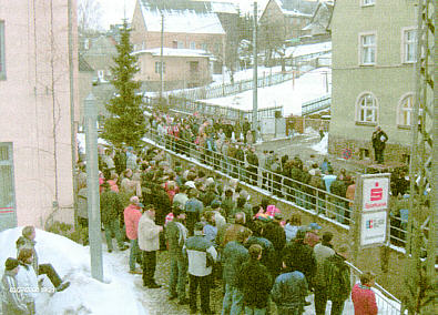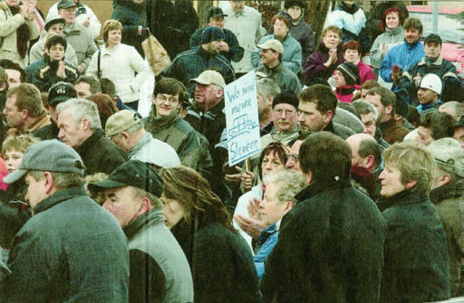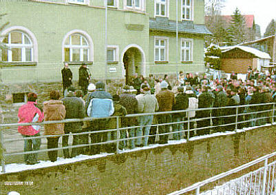 Vor dem ehemaligen Rathaus forderten am 20. Februar 350 Krumhermersdorfer die Instandsetzung der Ortsdurchfahrt durch den Landkreis Mittleres Erzgebirge.