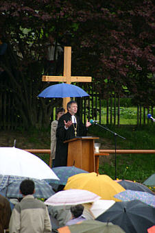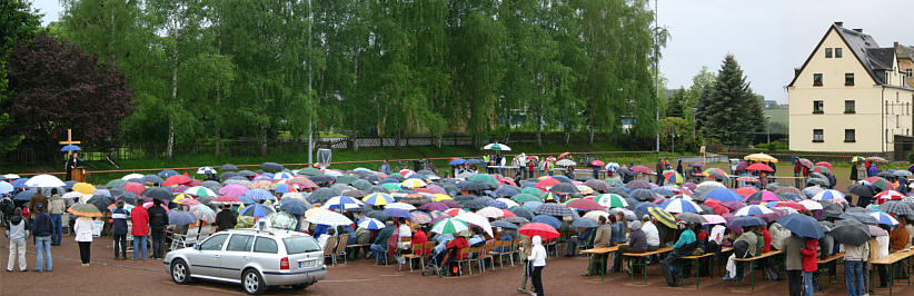 Zum Auftakt predigte Landesbischof Bohl heute auf dem ehemaligen Sportplatz. Trotz des ungewissen Wetters hatten sich etwa tausend Besucher aus Krumhermersdorf und den Nachbargemeinden eingefunden, miteinander Himmelfahrts-Gottesdienst zu feiern. Großes Lob gab es vom Bischof für das tapfere Aushalten, denn aus trübem Wetter wurde schließlich Nieselregen - die anschließend geplante Erfrischung mit Getränken und Bratwurst fiel darum ebenso wie der Verkauf der Festschrift etwas kurz aus.