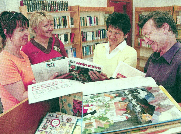 | Auch wenn der 20. Juni 2006 als letzter Tag der Bücherei in Krumhermersdorf in die Chronik eingeht, werden die Bücher nicht zugeschlagen. Leiterin Sigrid Weißbach, Bärbel Gerstenberger und Gudrun Bolomsky (v. l.) schauen bei Günter Hampel nach, was in der Kindertagesstätte weiter genutzt werden kann. |