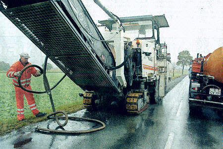 | Freie Presse 07.10.2006: Fräse entfernt ausgedienten Belag. Bevor die Börnichener Länge in den kommenden Tagen einen neuen Belag erhalten kann, entfernt Maschinist Uwe Kroener mit seiner Straßenfräse den alten. Um die Staubbetastung dabei so gering wie möglich zu halten, wird dabei stets Wasser zugeführt. Vier mal müssen die Arbeiter mit der Maschine die 4,3 Kilometer lange Strecke zurücklegen, um die alte Decke zu entfernen. Anschließend werden die Mitarbeiter der Firma Chemnitzer Verkehrsbau die Fahrbahn neu aufbauen, (hfj) |