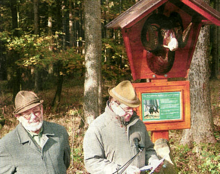 | Der Schnitzer und Heimatfreund Gottfried Kahl (l.) und Revierförster Stefan Möckel bei der Übergabe des neuen Bildstockes. |