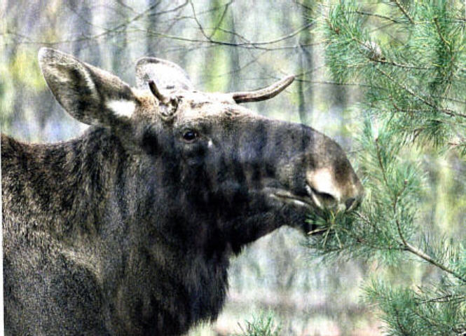 | Elche, so wie hier der Bulle Toke in einem Gehege im Biosphärenreservat Oberlausitzer Heide- und Teichlandschaft, ernähren sich von Ästen. Im Bornwald wartet auf den nun entdeckten Elch genügend Futter. |