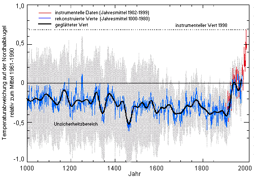 Die globale Erwärmung Rekonstruierte und gemessene mittlere Temperaturen der nördlichen Hemisphäre von 1000 bis 2000 n.Ch, relativ zum Mittelwert aus 1961 - 1990 (3. Fünfjahresbericht des IPCC, Januar 2001; www.ipcc.ch); die grauen Balken geben die statistische Fehlerbreite an. |
