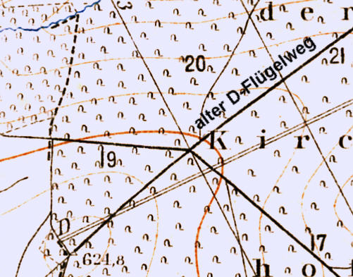 Am Kreuz Das ursprüngliche Wegekreuz (1450...1600) lag in der Nähe der Von hier aus führt der alte D-Flügelweg zum Schwarzen Teich. Gegen 1830 ließ man auch die rhombenförmige Gliederung des Bornwaldes weitgehend eingehen (die das alte Wegekreuz abgelöst hatte und zu dem der alte D-Flügelweg gehörte) und teilte den Wald in rechteckige nummerierte Schläge. Einige der alten Wege blieben erhalten, wie der Alte D-Flügelweg. Jetzt treffen sich Am Kreuz die folgenden Wege: