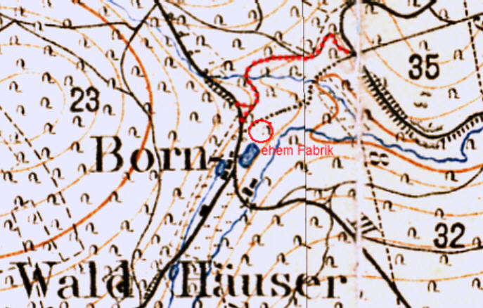 Der Fabrikbergweg (rot gepunktet) verbindet dei Bornwaldstraße (links) mit der Neunzehnhainer Straße (rechts). Seinen Name erhielt er von der direkt unterhalb des Weges liegenden Bornwaldspinnerei (ehemalige Fabrik). |