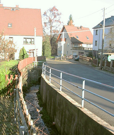 Der Dorfbach wird hier mehr als anderswo gezwungen. Nicht nur in dieses Bett eines Abwasserkanals, sondern auch, wirkliches Abwasser zu schlucken - man riecht es immer mal. Dass solch ein gemauerter Kanal keine Gewähr für Hochwasserschutz bietet, konnte man 2002 im Unterdorf sehen.
