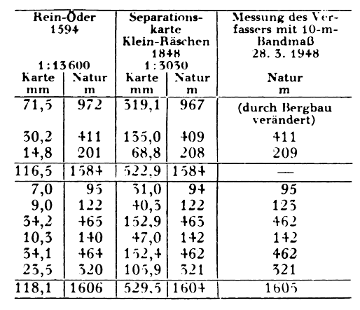 Da die Ortsgemarkungen die Grundzellen der territorialen und administrativen Einheiten bilden, sind durch die Wiedergabe der Herrschafts-, Amter- und Landesgrenzen im Kartenwerk ÖDERS zugleich viele Gemarkungsgrenzen enthalten. Sie verdichten sich bisweilen zum annähernd vollständigen Gemeindegrenzennetz, wie z. B. in manchen Teilen Mittelsachsens, wo die Grundherrschaften selten mehr als ein Dorf umfassen und wo eine starke Streulage zwischen Amts- und Gutsdörfern besteht, oder dort, wo die Staatsgrenze durch zahlreiche Exklaven einen sehr verwickelten Verlauf nimmt, wie etwa bei Bautzen in der Oberlausitz. Vergleicht man die dargestellten Grenzen mit ihrer Führung auf einer modernen Karte, etwa dem Meßtischblatt, so kann man eine sehr weitgehende Übereinstimung selbst in kleinsten Krümmungen und Verzahnungen feststellen. Wenn auch gelegentliche Ungenauigkeiten nicht ausbleiben, so geht andererseits die Darstellung mitunter sogar über das Meßtischblatt hinaus, indem z. B. im Ur-Öder auch die einzelnen Grenzmale zügiger Grenzstrecken als Zirkelstiche vermerkt sind, die das Meßtischiblatt nicht enthält. Als Beispiel für die z. T. hochgradige Genauigkeit ihrer Aufnahme seien die Längen der Grenzabschnitte zwischen den Dörfern Klein-Räschen und Dobristroh nördlich Senftenberg mitgeteilt, mit deren Messung sich der Verfasser in anderem Zusammenhang befaßt hat (6). Für die Untersuchung dieser Grenzzüge, die von MATTHIAS ÖDER im Jahre 1594 aufgenommen wurden (7) und damals sächsische Landesgrenze waren, konnte eine gegenüber denn Ur-Öder besser erhaltene, als Nadelstichkopie gefertigte Reinzeichnung im mittleren Maßstab 1: 15.600 herangezogen werden (8). Als Vergleichsmaterial dienten die Separationskarte Klein-Räschen 1: 5.000 (Ist-Maßstab = 1: 3030) voit 1848, die die Grundlage der heutigen Katasterkarte bildet, sowie eigene Messungsergebnisse des Verfassers. Die Werte sind in der folgenden Tabelle zusammengestellt.