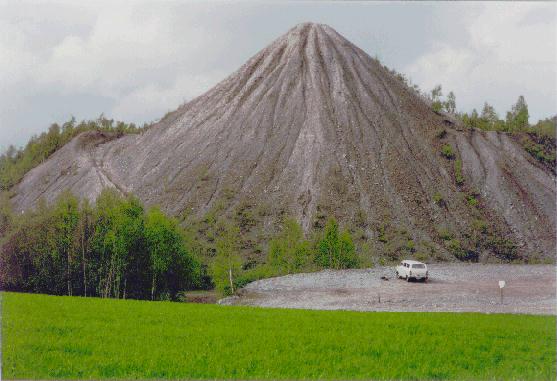 Spitzkegelhalde des Schachtes 48 (Himmelreich) zwischen Wolkenstein und Marienberg, die SDAG Wismut baute hier im Zeitraum 1947-1954 Uran ab (Foto: Th.Seifert 1992).