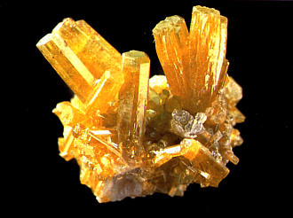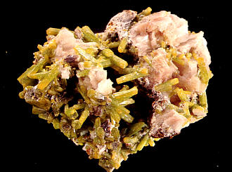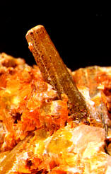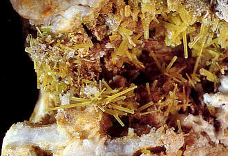 | Oben: Bis 4 mm lange nadelige Pyromorphit-Kristalle vom Maßnerschacht. Sammlung: Stopp. Foto: Weiß. Bis 4 mm lange Pyromorphit-Kristalle auf Baryt von der Halde am Maßnerschacht. Sammlung und Foto: Weiß |