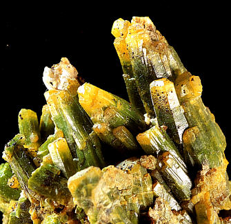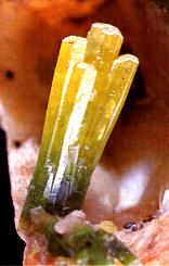 Farbzonare Pyromorphit-Kristalle von der Grube Heilige Dreifaltigkeit. Länge der Kristallgarbe 5 mm. Sammlung: Stopp. Foto: Weiß. |
