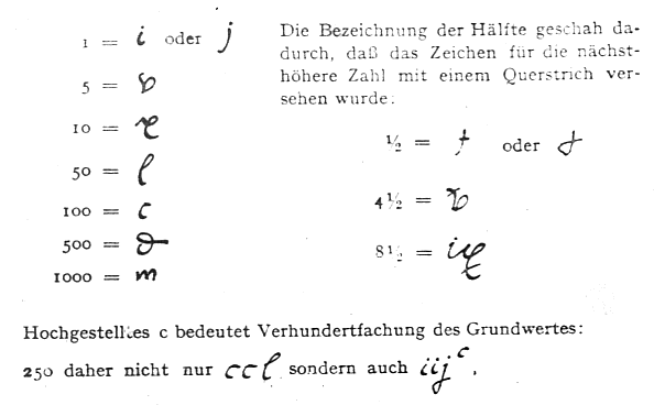 Zeitweise wurden diese Zahlen vorzugsweise mit Kleinbuchstaben geschrieben. Bei dieser Schreibung bedeutet ein durchgestrichenes i oder ein j "Ein-Halb" viij = 7½