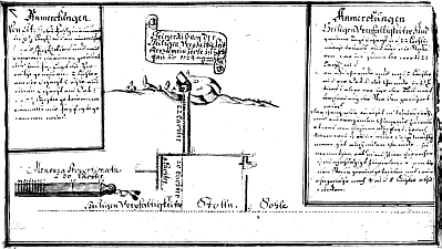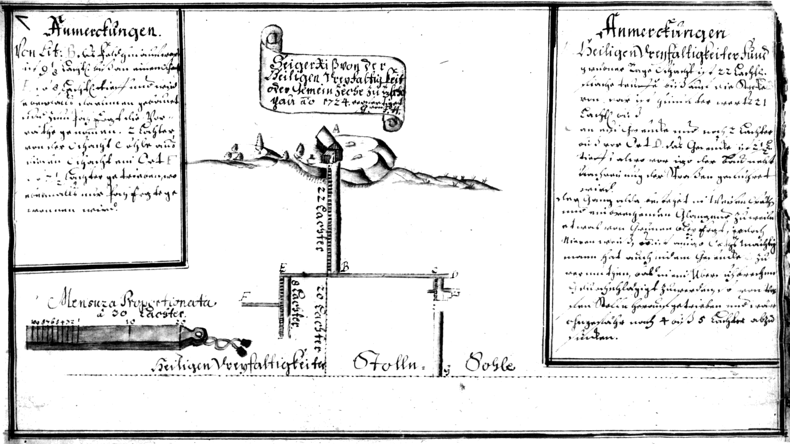A Heiligen Dreyfaltigkeiter Fundgrübner Tageschacht ist 22 lachter flache teuffe biß an die Strecke B von dar ist hinunterwärts 21 Lachter biß C an ein Gesenke und noch 2 Lachter biß vor Ort D Das Gesenke ist 2½ L. tieff, allwo vor itzo der Bach nebst Nachreichung der Straßen geführet wird.