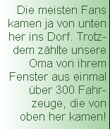 Außerhalb des Stadions unterbrechen Familien ihren Spaziergang. Am Kiosk steht man nach Bockwurst und Limonade an. Mit dem Rücken zum Spielfeld! Sie hören es ja,wenn ein Tor fallen sollte. Wiederholung gibt es aber nicht. "Ojeejeje", seufzt eine ältere Frau neben mir, "die Jungs machen ja den ganzen Platz zur Sau!" Nach einer Weile fügt sie hinzu: "Naja, morgen kommen die Kindergartenkinder und stopfen die Grasbatzen wieder rein." Eine Viertelstunde nach dem Schlußpfiff ist es wieder ruhig im Stadion. Ein entferntes Dröhnen ist noch zu hören - der Abschiedsgruß der Autolawine.