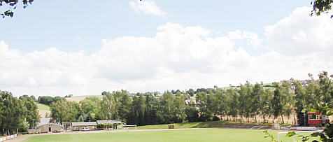 Der Weg zum Fußballplatz ist steil. Auf dem Sattel zwischen zwei Hügelkuppen finde ich das "Stadion der Bauarbeiter". Man sieht den Wald. und in der Ferne leuchtet weiß die Augustusburg - spielzeugklein.