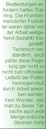 "Betrunken, unmöglich, sogar Schlägereien gab es schon mit denen!" Für die Krumhermersdorfer Fußballwelt ein Unding. Hier geht man nicht auf den Platz, um sich auszutoben - hier kennt man einander. Auch Zuschauer und Fußballer. Es trifft eine Spieler sicher härter, wenn ihm einer, der sein Nachbar sein könnte, zuruft: "Geh wieder arbeiten, du Null!", als wenn dieser Vorwurf anonym von den Rängen eines großen Stadions käme.